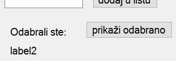 Želimo da se ako selektujemo jedan red u listBox-u, taj red prikaže u labeli. Zbog toga ćemo da upotrebimo labele i dugme kojim pokrećemo akciju. Dodajte ih kao na sledećoj slici: