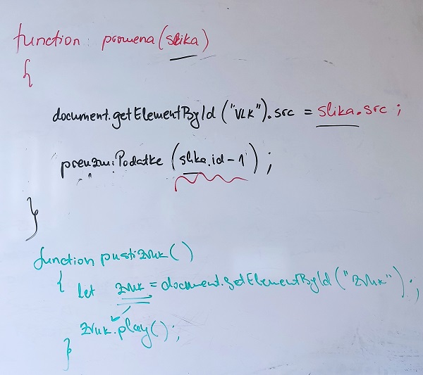 function promena(element) { document.getElementById("idVelikeSlika").src = element.src; preuzmiPodatke(element.id - 1); } - u ovakvoj funkciji se vidi da se kao prvi argument prenosi ceo element koji poziva finkciju ( slika ) - jet se koristi this