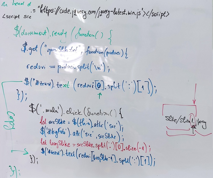 // ovo mora VAN jqDocReady!function promena(slika, brojReda) {let srcSlike = slika.src;$("#bigFoto").attr("src",srcSlike);$('#tekst').text(redovi[brojReda].split(':')[1]);}; - ili koristiti događaj klika na bilo koju malu sliku: