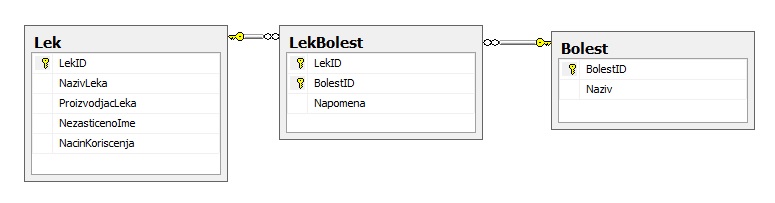 Kreirati bazu podataka Lekovi i u njoj tabele kao na slici: