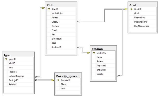 opcija:Za ocenu 5 (izveštaj iz dve ili tri tabele) Klikom na dugme na kojem piše "prikaz podataka o igračima" treba da se otvori nova forma u kojoj se nalazi DatagridView komponenta u kojoj su prikazani sledeći podaci : ime i prezime igrača, klub u kojem igra i pozicija na kojoj igra (druga varijanta je da se traži da se ovo prikaže u listbox ili listView komponenti)