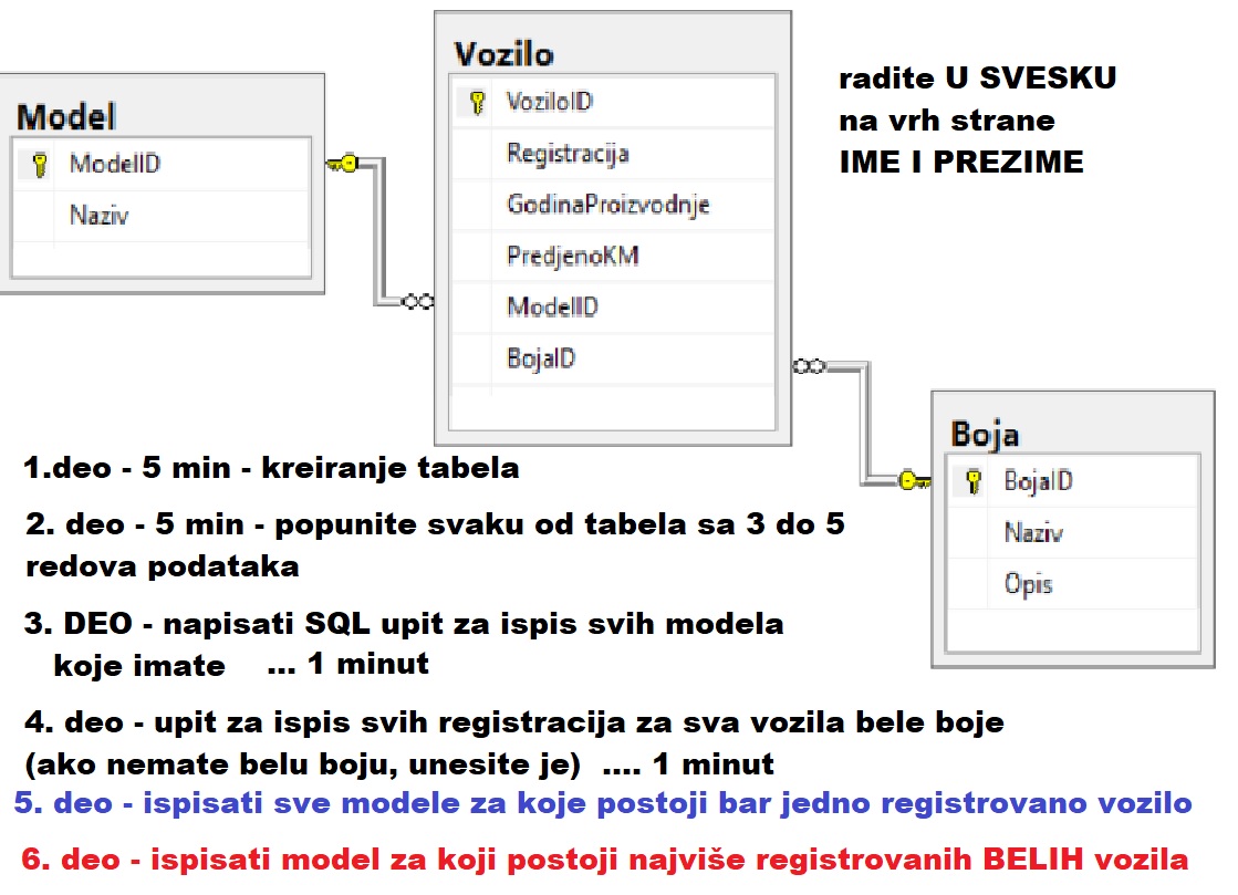 Ovde se koristi CROSS JOIN sa kojim se kreiraju sve moguće kombinacije svega iz obe tabele. Iako ne piše eksplicitno, to je zarez između naziva tabela ... Prvo se selektuje koji je BojaID za Belu boju, a onda se ispišu sve jednistvene registracije. Ako ne postavite DISTINCT, imaćete duplikate u vašim rezultatima.SELECT DISTINCT vozilo.Registracija FROM vozilo, boja WHERE vozilo.BojaID = (SELECT BojaID FROM boja WHERE Naziv = 'Bela')