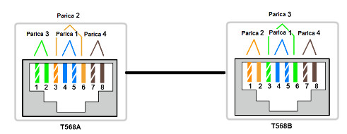 Sledeća slika prikazuje način kreiranja Crossover kabla pomoću T568a i T568B standarda.