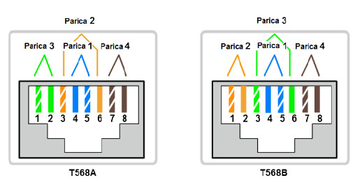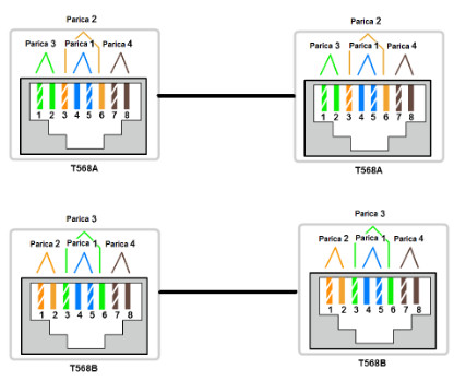 Sledeća slika prikazuje način kreiranja Straight-through kabla pomoću T568a ili T568B standarda.
