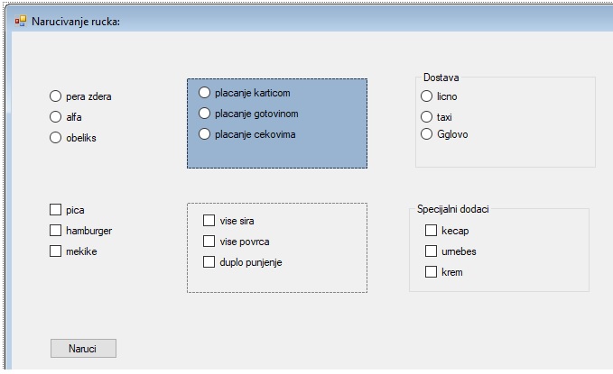 Na formu postaviti prvo 3 radio button-a (za izbor lokala iz kojega se naručuje), a zatim Panel u kojem se postavljaju sledeća 3 radioButton-a za izbor načina plaćanja, i na kraju groupBox na koji se postavljaju još 3 radioButton-a za izbor načina dostave.