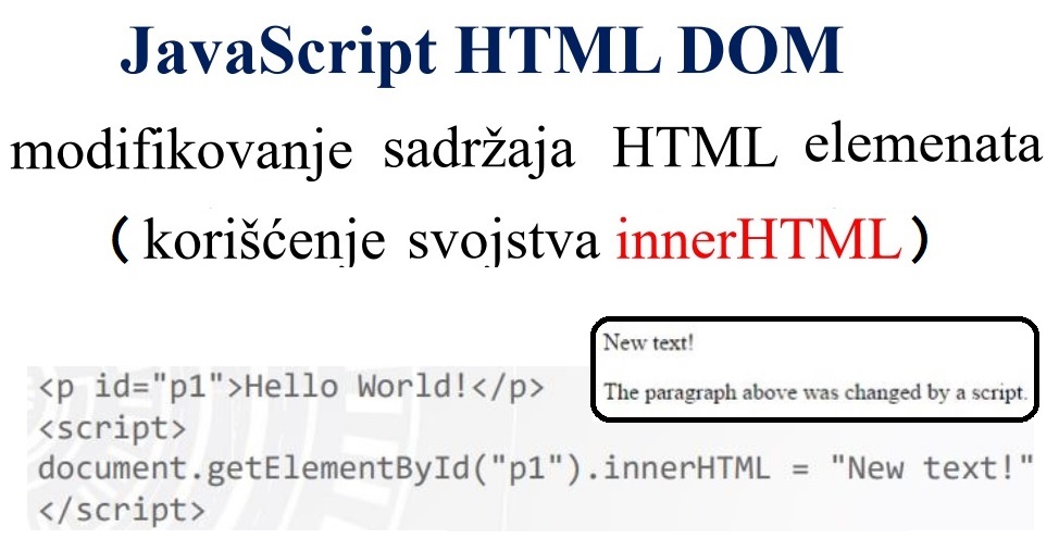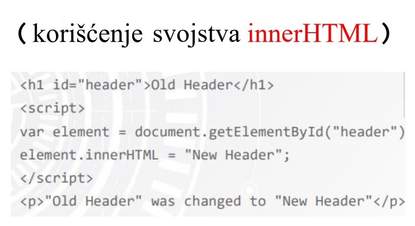 - innerHTML - menja HTML elementa (ako se nalazi sa leve strane jednakosti tada menja vrednost HTML elementa, a ako se nalazi sa desne strane jednakosti tada samo dohvata vrednost HTML elementa)