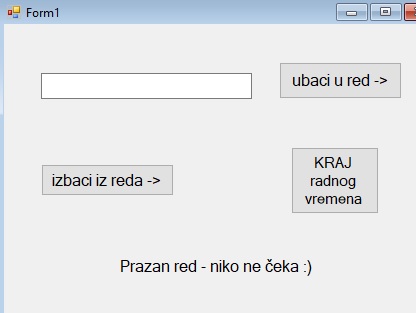 Kada se klikne na dugme za ubacivanej deteta u red, tekst koji je u textBox-u se ubacuje u red. Zatim se očisti sadržaj TextBox-a da se ne bi unelo isto dete dvaput u red. U labeli na dnu se ispisuje koliko dece ćeka u redu.