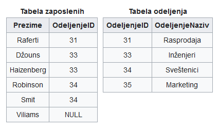 Na primer, ovo nam omogućava da vidimo svakog zaposlenog koji je u odeljenju i svako odeljenje koje ima nekog zaposlenog, ali i da vidimo svakog zaposlenog koji nije deo odeljenja i svako odeljenje koje nema zaposlenog.