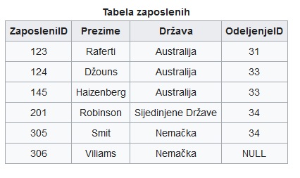 ******************** CREATE DATABASE TEST3; USE TEST3; ********************USE TEST3; CREATE TABLE odeljenje ( OdeljenjeID INT, OdeljenjeNaziv VARCHAR(20) ); CREATE TABLE zaposleni ( Prezime VARCHAR(20), OdeljenjeID INT ); INSERT INTO odeljenje VALUES(31, 'Rasprodaja'); INSERT INTO odeljenje VALUES(33, 'Inženjeri'); INSERT INTO odeljenje VALUES(34, 'Sveštenici'); INSERT INTO odeljenje VALUES(35, 'Marketing'); INSERT INTO zaposleni VALUES('Raferti', 31); INSERT INTO zaposleni VALUES('Džouns', 33); INSERT INTO zaposleni VALUES('Haizenberg', 33); INSERT INTO zaposleni VALUES('Robinson', 34); INSERT INTO zaposleni VALUES('Smit', 34); INSERT INTO zaposleni VALUES('Viliams', NULL);